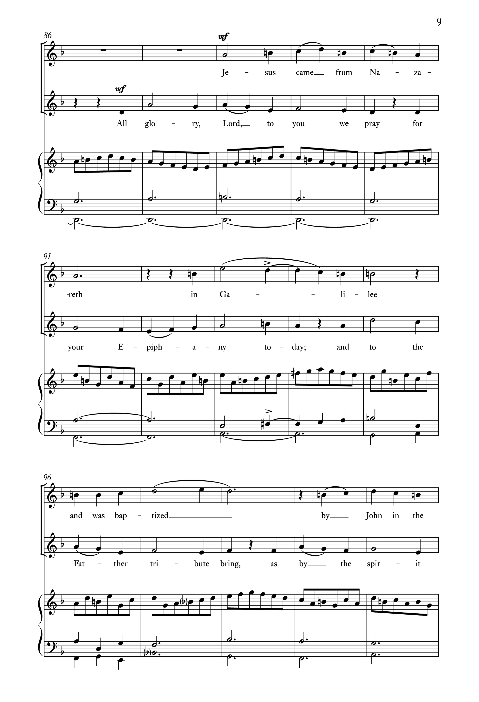 Bruce Neswick's Jesus came from Nazareth pairs the opening of Mark's baptism narrative with an office hymn for Matins on the First Sunday after the Epiphany. This lively, modal setting is ideal for smaller choirs or soloists, with tuneful, folk-inflected vocal lines that are both accessible and musically rewarding.